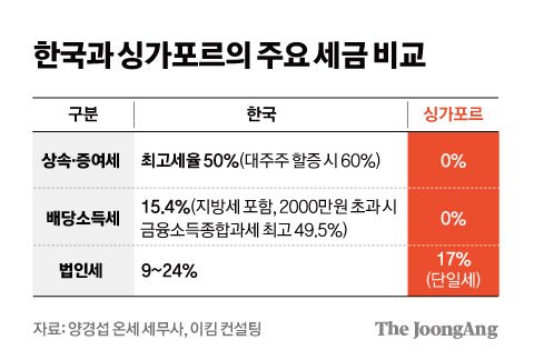 한국에서 여러 개의 사업체를 운영했던 K(72)씨도 코로나 직전에 가족과 싱가포르 행을 택한 데는 상속세 영향이 컸다. 그는 “이대로 회사를 물려줬다간 60% 상속세(대주주 할증 포함) 폭탄을 맞을 수 있었다”며 “(자녀들이) 재원 마련으로 회사 주식을 팔면 경영권조차 흔들릴 수 있어 고민 끝에 사업을 정리했다”고 말했다. 현재 싱가포르에서 변호사로 활동하는 이모씨는 “싱가포르는 특히 (고액자산가의 재산을 전담 관리ㆍ운용하는 회사인) 패밀리오피스 설립 요건이 까다롭지 않은 데다 세금 면제 혜택 등으로 부자들이 재산을 지키는 동시에 불릴 곳으로 선호한다”고 전했다.