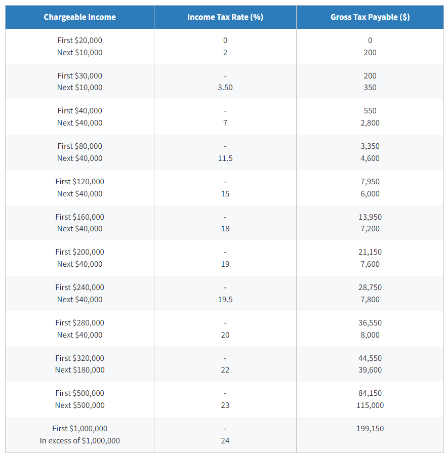 2023년도 소득에 대해서, 기존 최대세율이 22%에서 24%로 증가되며, 이는 1년 소득 S$50만불 이상 고소득자에 대해서만 적용된다. 기존 S$50만불 미만의 소득자는 과거와 동일하다.
